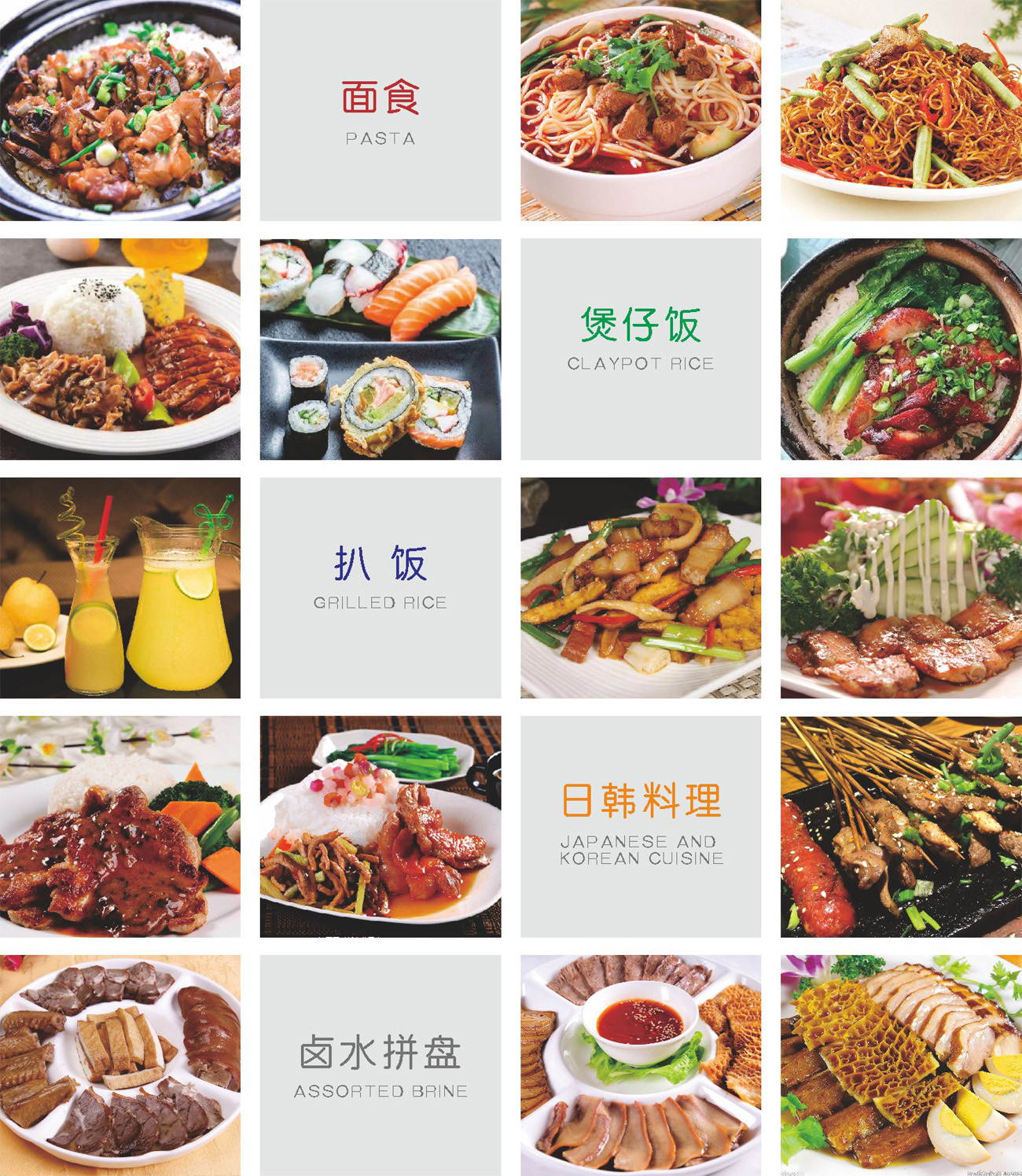 設立提供不同口味、不同類型的特色檔口,提供各類中西式特色快餐,如蓋燒飯、小砂鍋、煲仔飯、套餐飯、美味小食店、點心面食店等各式精美菜肴及粵、湘、川等特色風味菜