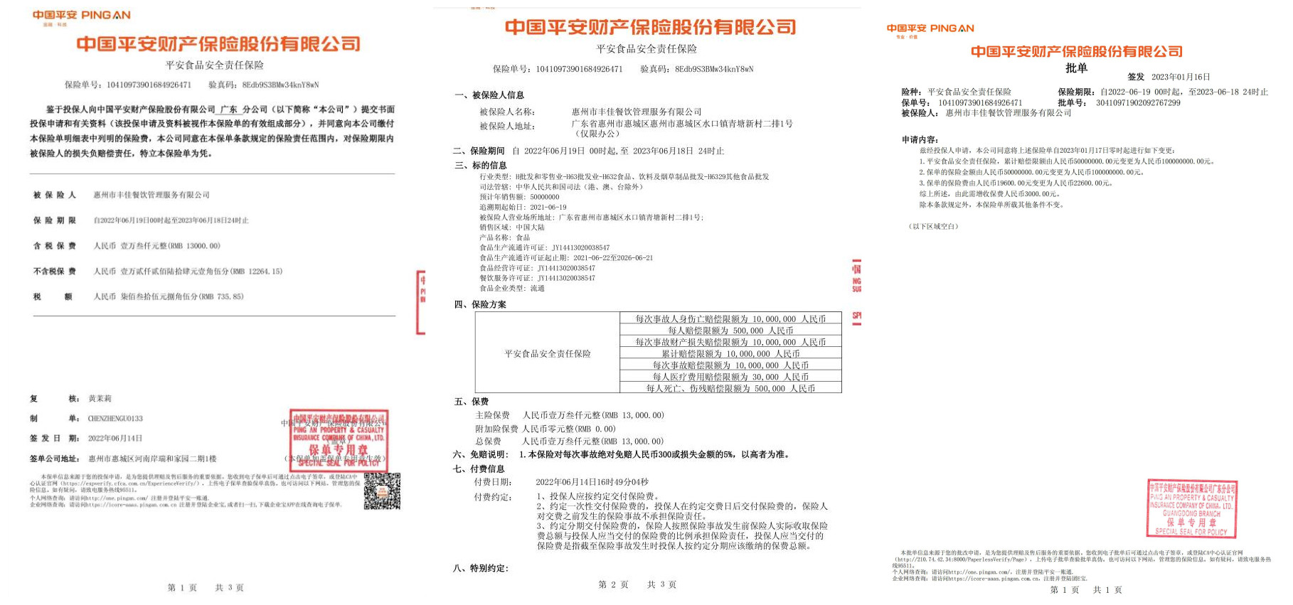 我司由中國平安財產(chǎn)保險股份有限公司承保,食品安全責(zé)任保險,保額為壹億元人民幣。